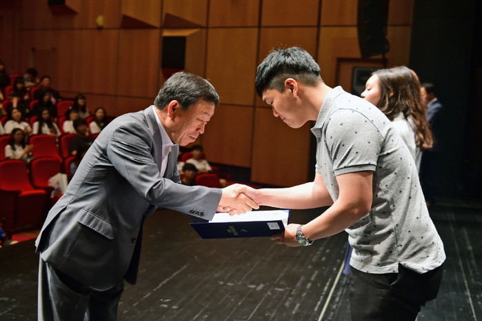 최근 경기도 안산시 안산문화예술의전당 달맞이극장에서 열린 ‘2016년도 안산꿈키움장학생 장학증서 수여식’에서 한 학생이 제종길 시장(왼쪽)으로부터 장학증서를 전달받고 있다.(사진제공=안산시청)
