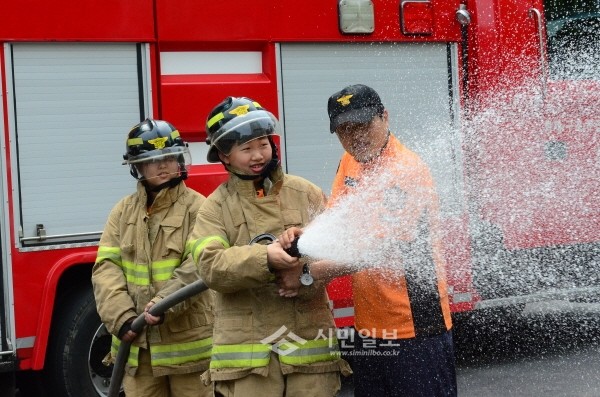 지난 31일 서울 영등포소방서는 신영초등학교 119소년단원과 지도교사를 대상으로 '신바람 나는 119소년단 영등포소방서 119투어'를 실시했다. 사진은 학생들이 소방호스 사용 실습을 하는 모습.(사진제공=영등포소방서)