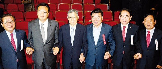 새누리당 김희옥 혁신비대위원장과 정진석 원내대표, 정갑윤 전국위원장, 원유철 전 원내대표, 박명재, 전희재 전국위 부위원장이 2일 오후 국회에서 열린 새누리당 제4차 전국위원회를 마친 뒤 손을 맞잡고 기념촬영을 하고 있다.