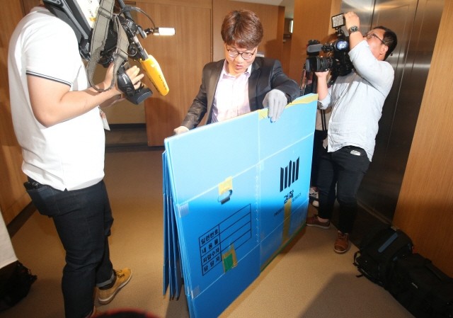 검찰이 2일 정운호 네이처리퍼블릭 대표의 면세점 입점 로비의혹에 대한 수사를 위해 롯데호텔 면세사업부 압수수색에 나섰다. 이날 오전 검찰 수사관이 압수물품을 담을 박스를 들고 서울 소공동 롯데호텔 면세사업부 사무실로 들어가고 있다.