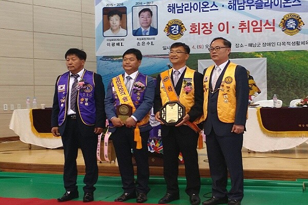 국제라이온스협회 355-B2지구 해남클럽과 해남우슬클럽은 이날 한자리에서 2016-2017년도 해남라이온스클럽 43대 이광배 회장의 이임과 44대 손은수 회장의 취임, 그리고 해남우슬라이온스클럽 5대 김승남 회장 이임 및 6대 신영세 신임회장의 취임식을 가졌다.
