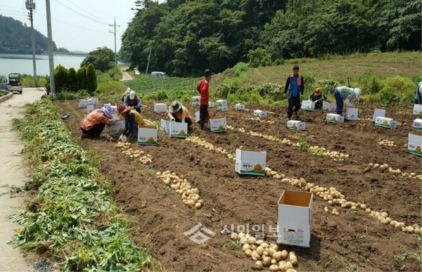 최근 전남 장흥군 안양면은 로하스봉사단과 함께 휴경지 1345㎡을 활용해 재배·수확한 감자 60박스(10kg)를 지역 경로당과 어려운 이웃에 전달했다. 사진은 관계자들이 감자를 수확하는 모습.(사진제공=장흥군청)