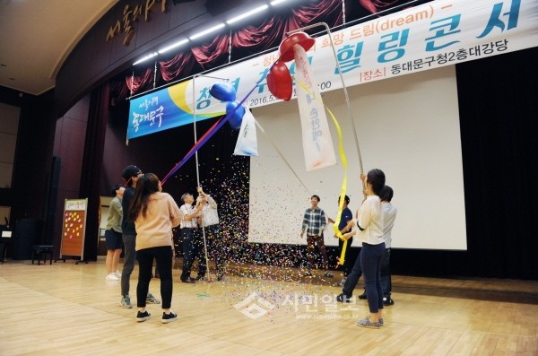 최근 서울 동대문구가 취업에 어려움을 겪고 있는 청년들에게 희망을 주기 위해 서울시 자치구 최초로 계획한 '청년 취업 힐링콘서트'가 성황리에 마무리됐다. 사진은 행사에 참석한 취업준비생들이 희망의 박을 터트리는 모습.(사진제공=동대문구청)