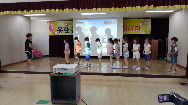 최근 충남 아산시 금곡초등학교 2학년 학생 77명은 교내 다목적실에서 자신만의 장기와 재주를 뽐내는 '꿈·끼 발표회'를 열었다. 사진은 어린이들이 줄넘기를 하는 모습.(사진제공=아산교육지원청)