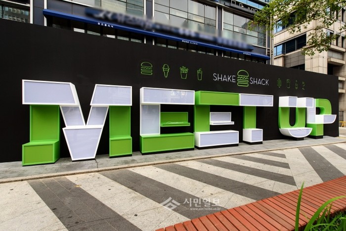 국내 쉐이크쉑 1호점 호딩 이벤트 테마는 'MEET UP, POWER UP(만나자, 힘내자)'으로 열정적이고 에너지 넘치는 서울과 강남대로의 이미지에서 착안해 기획했다. 직육면체 블록을 쌓아 쉴 수 있는 의자와 테이블, 휴대폰을 충전할 수 있는 케이블을 비치한 휴식공간으로 만들어 휴대폰을 충전하듯 우리 모두 힘내자는 의미를 담았다.