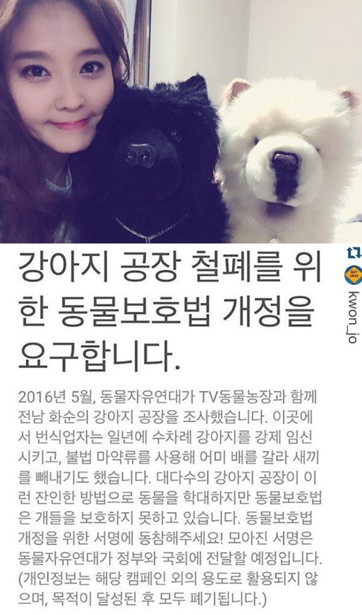 특히 관련 내용에는 '전남 화순의 강아지 공장'에 대한 고발이 담겨있었다. 글에는 '대다수의 강아지 공장이 잔인한 방법으로 동물을 학대하지만 동물보호법은 개들을 보호하지 못하고 있습니다. 동물보호법 개정을 위한 서명에 동참해주세요!'라는 내용으로 가득차 있었던 것.