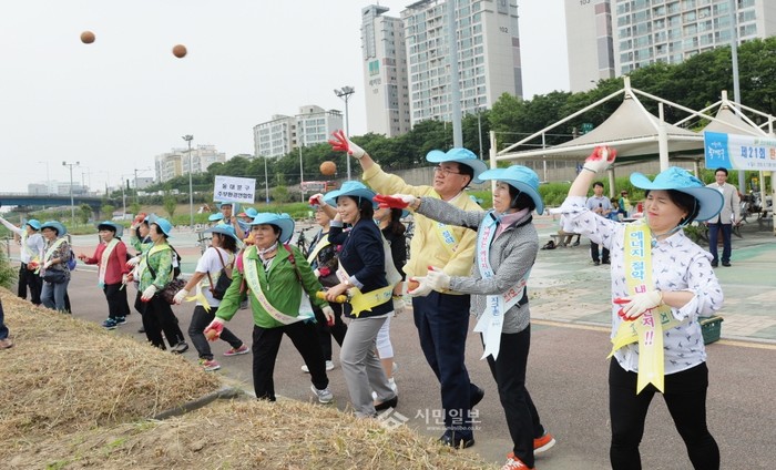 지난 7일 오전 9시40분 서울 중랑천 제1체육공원에서 진행된 ‘동대문구 환경의 날 기념행사’에서 유덕열 구청장(오른쪽에서 세 번째)과 환경단체 회원들이 중랑천으로 EM 흙공을 던지고 있다.(사진제공=동대문구청)