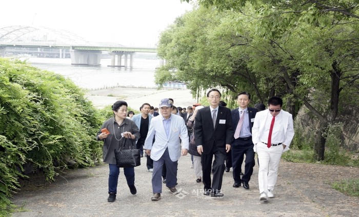 최근 박홍섭 마포구청장은 한강르네상스호 선상에서 열린 '제6차 마포관광조찬포럼'에 참석했다. 사진은 박 구청장(왼쪽에서 두 번째)이 양화진뱃길탐방의 코스 중 하나인 선유도에 도착해 관광업계 관련 인사들과 함께 답사하는 모습.(사진제공=마포구청)