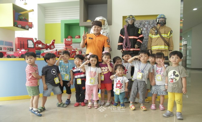 지난 7일 은평소방서는 시민안전체험관을 방문한 지역내 은아새어린이집 원생 및 지도교사 20여명에 대해 '화재예방 소방안전교육'을 실시했다. 사진은 이날 교육에 참석한 어린이들이 기념촬영을 하는 모습.(사진제공=은평소방서)