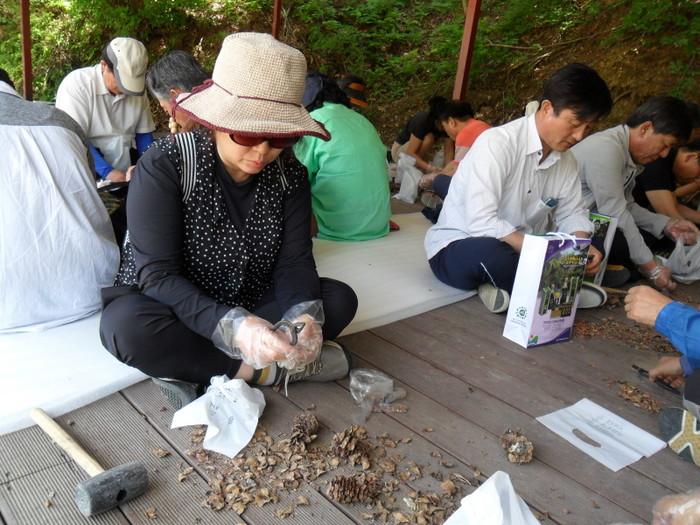 최근 귀농예정 견학자 50여명이 경기 포천시 농업기술센터 주관으로 신북면 포천시 지동산촌마을을 방문했다. 사진은 참가자들이 지동산촌마을의 특산품인 잣을 주제로 잣까기 체험을 하는 모습.(사진제공=포천시청)