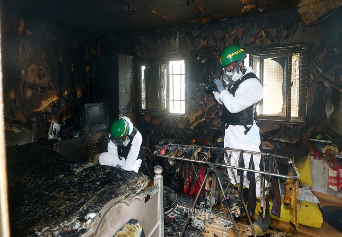 8일 오전 대구시민안전테마파크 야외 주차장에서 열린 '대구소방 화재감식경연대회'에 참가한 화재조사관이 모의화재 현장에서 원인과 발화지점을 찾고 있다.