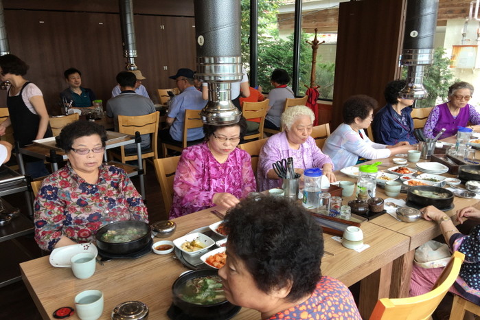 지난 8일 경기 동두천시 생연2동에 위치한 동동갈비는 대방노블랜드아파트 경로당 노인 20여명을 초청해 갈비탕을 제공했다. 사진은 행사에 참석한 노인들이 식사하는 모습.(사진제공=동두천시청)