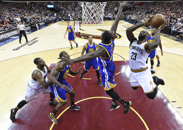| ▲ 르브론 제임스가 드레이먼드 그린을 앞에 두고 골밑 돌파를 하고 있다. /AP=연합뉴스 | ||