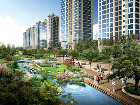 원터치 에코 편의시설들로 친환경 생태단지를 지향하면서 2.5㎞ 산책로, 1㎞ 자전거길, 200m 생태연못, 계류, 자연학습장, 과수원으로 입주민들의 쾌적한 환경을 위해 노력했다. 단지 내에는 축구장 1.5배 크기의 중앙에코광장(1만㎡)과 야외공연장, 잔디광장, 빛의광장 등이 구성돼 있다.