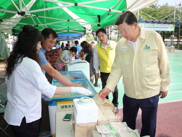 조길형 서울 영등포구청장(오른쪽)은 지난 9일 신길근린공원에서 열린 농수산물직거래장터 현장을 방문해 판매 상품을 살펴보며 상인들로부터 설명을 듣고 있다.(사진제공=영등포구청)