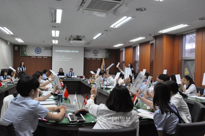 최근 충남 아산에 소재한 충남외국어고등학교는 학생들에게 국제기구와 관련된 전공탐색의 기회를 제공해 글로벌 리더십 함양과 영어 토론능력을 향상시키기 위한 '모의유엔 대회(CFLHS MUN Conference)'를 개최했다. 사진은 참가 학생들이 토론하는 모습.(사진제공=아산교육지원청)