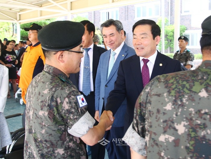 최근 임춘대 서울 송파구의장은 제6019부대 연병장에서 열린 '제6019부대장 이취임식'행사에 참석해 송광석 부대장의 취임을 축하했다. 사진은 임 의장(오른쪽)과 송 부대장이 악수하는 모습.(사진제공=송파구의회)