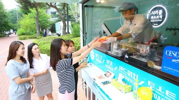 서울 서초구는 서리풀 푸드트럭 1호를 허용지역내 이동 가능한 프리존(Free zone)으로 운영한다고 밝힌 가운데, 최근 구청사 앞 양재역 12번출구 앞에 위치한 푸드트럭에 방문한 구청 직원들이 핫도그를 주문하고 있다.(사진제공=서초구청)