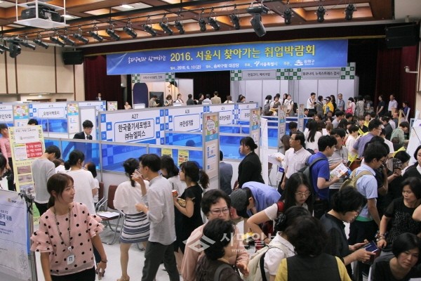 지난 10일 오후 서울 송파구청 대강당에서 '2016년 송파구 찾아가는 취업박람회'가 개최됐다. 사진은 취업박람회를 방문한 구직자들이 채용부스를 둘러보고 있는 모습.(사진제공=송파구청)