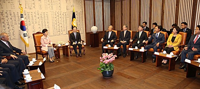 박근혜 대통령이 20대 국회 개원연설차 13일 국회를 방문, 본회의장에서 연설을 마친 뒤 국회의장 접견실을 찾아 정세균 국회의장, 여야 대표 등과 환담하고 있다.