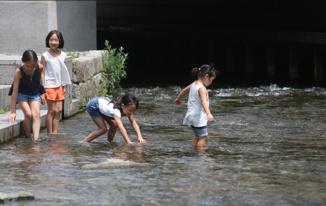 무더위가 계속된 13일 오후 서울 청계천에서 시민들이 더위를 식히고 있다.