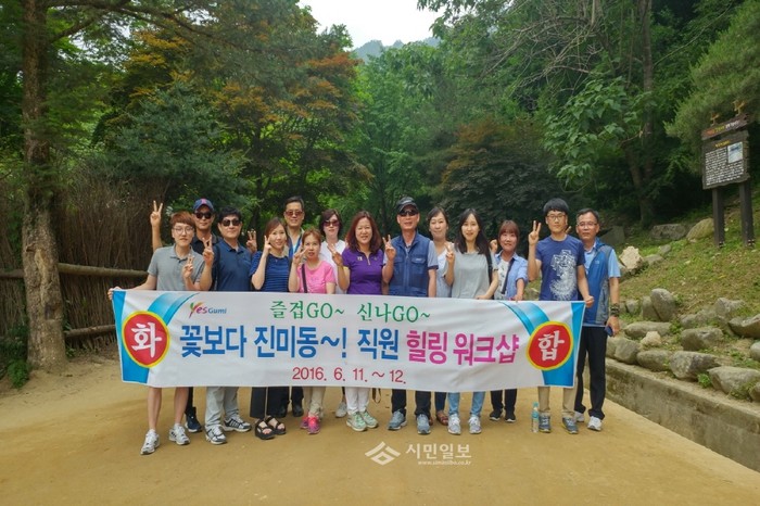 최근 경북 구미시 진미동에서는 전 직원이 참여한 가운데 '건강, 소통, 관계쉽, 이야기로 조직문화를 경영하라'는 맞춤형 건강소양 워크숍을 실시했다. 사진은 행사에 참석한 직원들이 기념촬영을 하는 모습.(사진제공=구미시청)