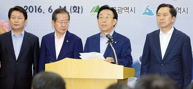 권영진 대구시장, 홍준표 경남도지사, 김관용 경북도지사, 김기현 울산시장(왼쪽부터)이 14일 오후 경남 밀양시청 회의실에서 대한민국 백년대계인 남부권 신공항은 반드시 성사돼야 한다는 공동 기자회견문을 발표하고 있다.