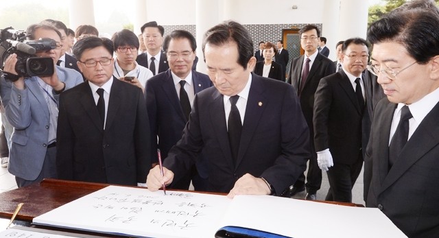 정세균 국회의장이 14일 오전 서울 동작구 국립서울현충원을 참배한 뒤 방명록을 작성하고 있다.