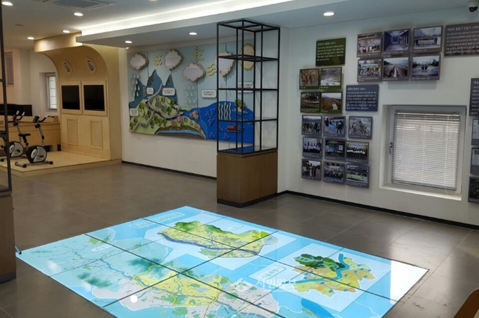 | ▲ '중랑천환경센터' 1층 전시콘텐츠 공간에 '하천유역 체험존'이 마련돼 있다. | ||