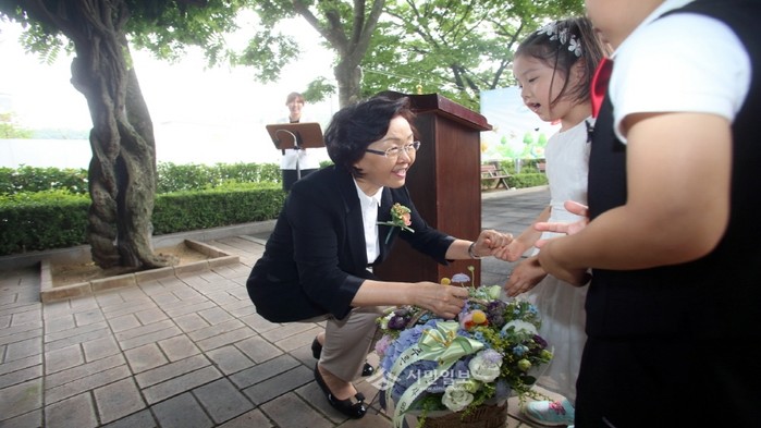 지난 14일 오후 4시 강남구는 세곡동에서 '강남구립 푸른어린이집 개원식'을 개최했다. 사진은 개원식에 참석한 신연희 구청장(왼쪽)이 어린이와 인사하는 모습.(사진제공=강남구청)