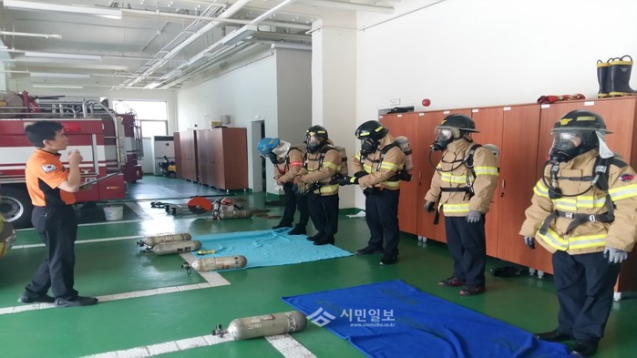 최근 서울 은평소방서는 외근 소방공무원을 대상으로 상반기 소방전술훈련 평가를 실시했다. 사진은 평가에 참석한 소방공무원들이 공기호흡기 장착 훈련을 하는 모습.(사진제공=은평소방서)