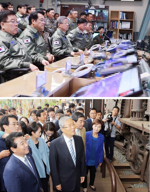 새누리당 김희옥 혁신비상대책위원장과 정진석 원내대표, 김광림 정책위의장, 김영우 국회 국방위원장 등 지도부들이 15일 오전 경기도 오산 항공우주작전본부내 지휘소에서 작전현황을 보고받고 있다(위). 더불어민주당 김종인 비상대책위 대표와 비대위원들이 15일 오전 경기도 파주시 문산읍 임진각전망대에서 비상대책위원회의를 마친 뒤 ‘경의선 장단역 증기기관차 화통’을 둘러보고 있다.