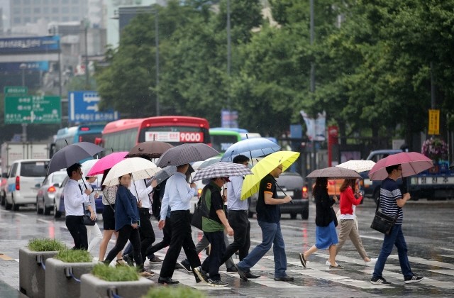 전국적으로 빗방울이 떨어진 15일 오후 서울 종로구 광화문 광장에서 우산을 쓴 시민들이 발걸음을 서두르고 있다.