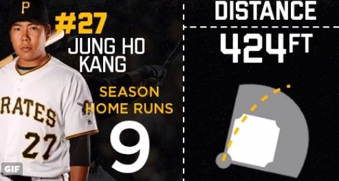 강정호는 디그롬과의 첫 대결에서 볼넷을 얻어내며 순조롭게 출발했다. 이어 다음 타석에서는 중견수 앞 안타를 때려냈다. 6회 세 번째 타석에서는 디그롬의 151km 패스트볼을 받아쳐 가운데 담장을 넘기는 투런 홈런을 쏘아올리며 시즌 9호 홈런을 기록했다.