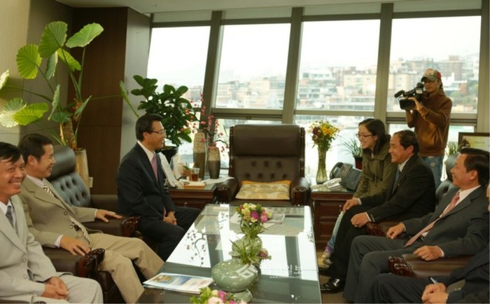 | ▲ 베트남 퀴논시 대표단이 서울 용산구청을 방문한 가운데 환영간담회에서 성장현 용산구청장(왼쪽 세 번째)과 구, 퀴논시 관계자들이 담소를 남누고 있다. | ||