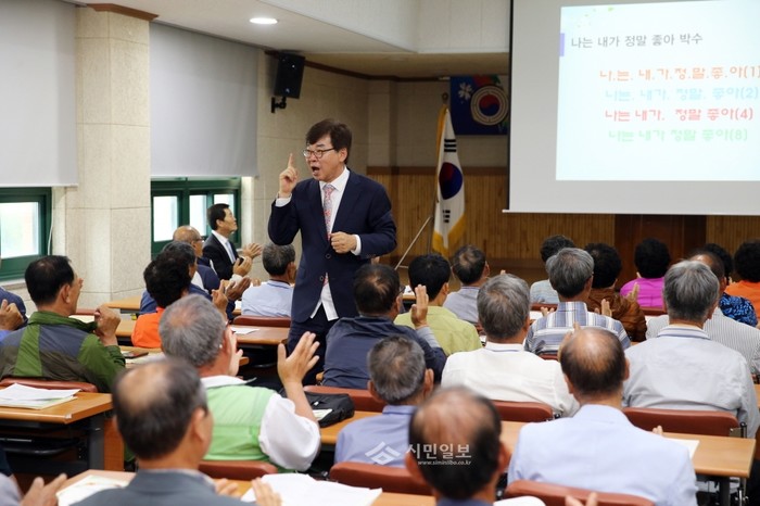 지난 15일 김성 전남 장흥군수는 군 보건소 회의실에서 노인대학생 80여명이 참석한 가운데 '웃음으로 행복한 삶'이라는 주제로 노년의 삶의 방향과 미래설계에 대한 특강을 실시했다. 사진은 김 군수가 강연을 진행하고 있는 모습.(사진제공=장흥포토)