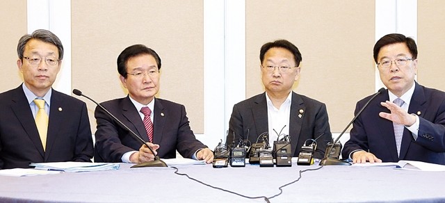 새누리당 김광림 정책위의장(오른쪽)이 16일 오후 국회 귀빈식당에서 열린 정부와 여야3당 정책위의장 간 제2차 민생경제점검회의에서 발언하고 있다. 왼쪽부터 국민의당 김성식, 더불어민주당 변재일, 유일호 부총리 겸 기획재정부 장관 김광림.