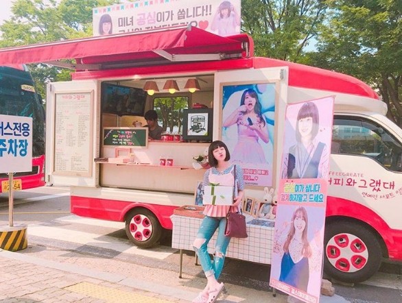 공개된 사진 속 민아는 팬들이 보내 준 간식차 앞에서 귀여운 표정으로 서 있다.