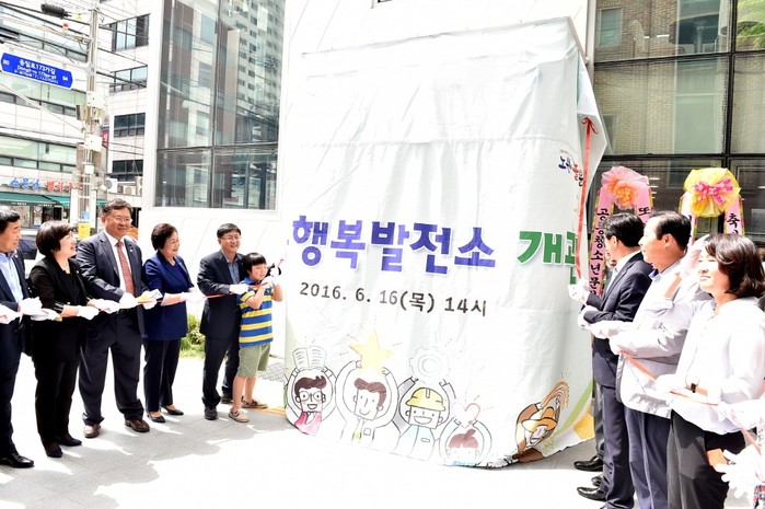 김성환 노원구청장(왼쪽에서 다섯 번째)이 지난 16일 오후 2시에 진행된 문화복합센터인 공릉동행복발전소 개관식에 참석해 김승애 노원구의장(왼쪽에서 네 번째) 등 내빈들과 제막 행사를 진행하고 있다.(사진제공=노원구청)