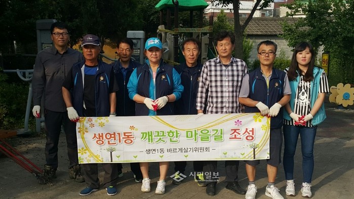 지난 19일 경기 동두천시 생연1동 바르게살기위원회는 위원들과 함께 지역내 놀이터에 대한 제초작업과 함께 방치된 쓰레기를 수거했다. 사진은 행사에 참석한 관계자들이 기념촬영을 하는 모습.(사진제공=동두천시청)