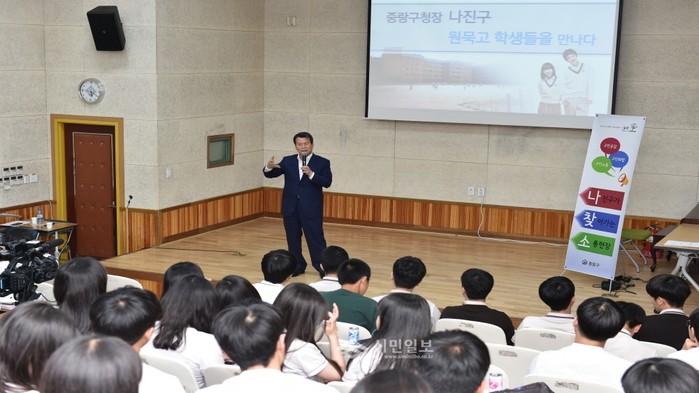 최근 중랑구는 원묵고등학교 시청각실에서 원묵고 학생 200여명을 대상으로, 미래에 대한 꿈과 희망을 심어주기 위한 토크쇼를 개최했다. 사진은 나진구 구청장이 학생들에게 강연하는 모습.(사진제공=중랑구청)