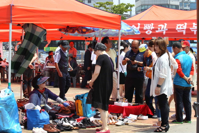 지난 18일 인천 동구는 18일 동인천역 북광장에서 가정에서 사용하지 않는 중고물품 또는 재활용품을 자유롭게 거래하는 ‘금융기관, 병·의원과 함께하는 나눔장터’를 성황리에 개최했다. 사진은 장터를 찾은 주민들이 물품을 살펴보는 모습.(사진제공=인천 동구청)