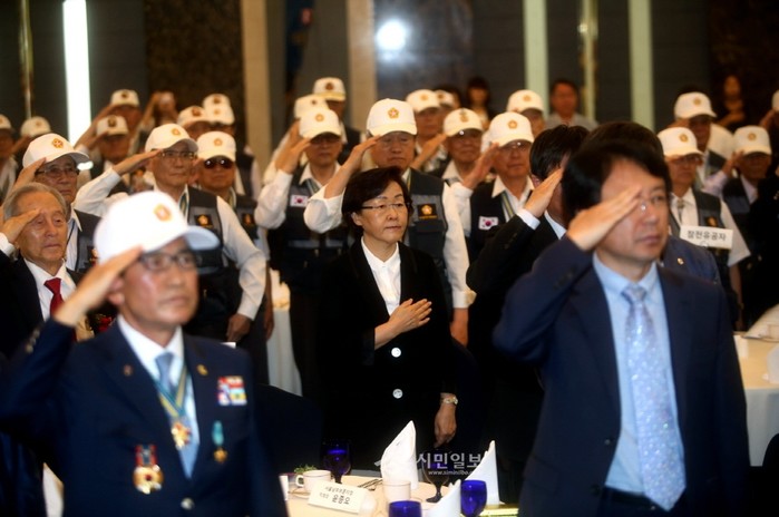 지난 20일 신연희 서울 강남구청장은 지역내 호텔에서 6.25 참전유공자 강남구지회 주관으로 개최된 ‘6.25 상기 안보결의대회’에 참석했다. 사진은 신 구청장(가운데)이 국기에 대한 경례를 하는 모습.(사진제공=강남구청)