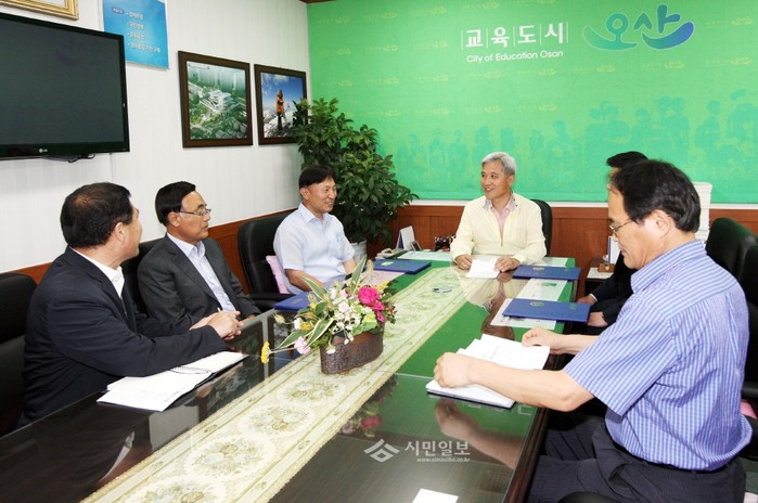 최근 경기 오산시는 세무사들의 재능기부로 운영되는 마을세무사 6명에게 위촉장을 수여하고 시민들의 세금 고민 해결을 위해 무료 세무상담을 시작했다. 사진은 곽상욱 시장(가운데)이 세무사들에게 위촉장을 수여한 뒤 이야기를 나누는 모습.(사진제공=오산시청)