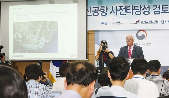 21일 오후 정부세종청사 국토교통부 공용브리핑룸에서 열린 ‘동남권 신공항 사전타당성 검토 연구 최종보고회’에서 입지선정 용역을 벌여 온 프랑스 파리공항공단엔지니어링(ADPi) 장 마리 슈발리에 수석 엔지니어가 연구결과를 발표하고 있다.