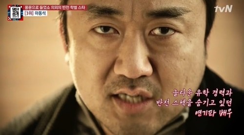 마동석은 과거 방송된 tvN ‘명단공개 2015’의 ‘반전 학벌을 가진 스타’ 명단에 올랐다.