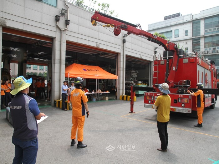 지난 21일 동작소방서는 구조공작차를 이용한 '소방차운용사 1급 실기 평가'를 실시했다. 사진은 소방관이 소방차를 작동하며 평가를 받고 있는 모습.(사진제공=동작소방서)
