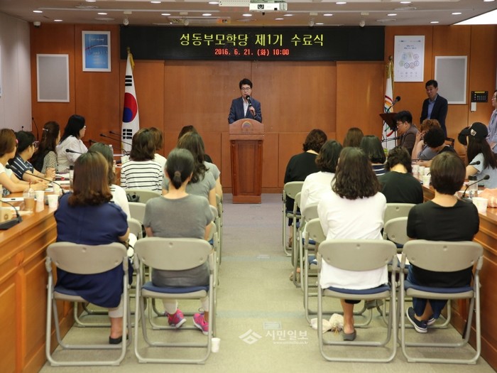 지난 21일 성동구는 자녀가 좋아하고 잘하는 것을 찾아 재능을 발휘할 수 있도록 돕는 부모 진로교육인 '성동부모학당'의 제1기 수료식을 개최했다. 사진은 수료식에서 정원오 구청장이 축사하는 모습.(사진제공=성동구청)