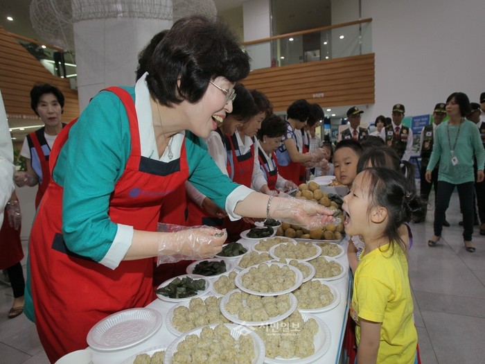 지난 21일 박춘희 송파구청장이 한국자유총연맹 송파구지부 주최로 구청사 로비에서 진행된 ‘6.25음식 시식회 및 안보사진 전시회’에 참석해 어린이집 원아들에게 쑥개떡과 수박 등을 나눠주고 있다.(사진제공=송파구청)