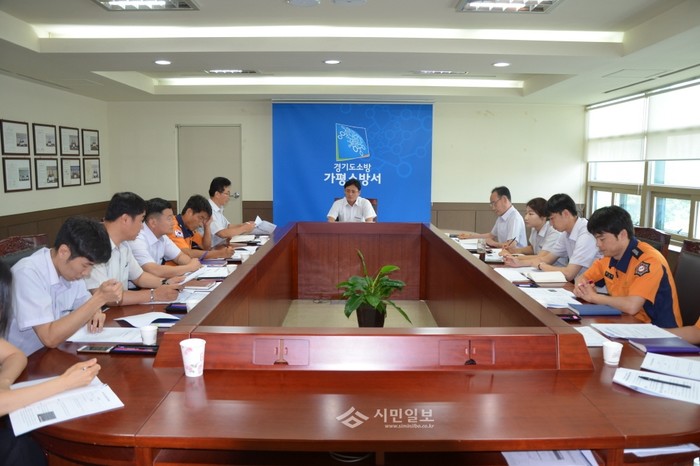 22일 경기 가평소방서는 2층 소회의실에서 외근부서 업무개선을 통한 내부청렴도 향상을 위해 2·4분기 청렴T/F팀 회의를 개최했다. 사진은 강신광 서장(가운데)이 직원들과 회의하는 모습.(사진제공=가평소방서)